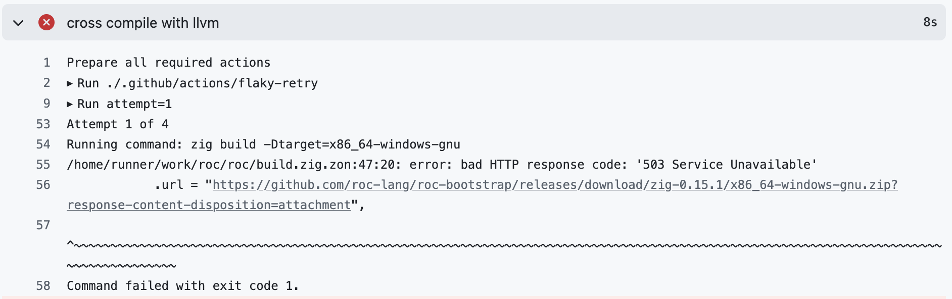 Is it just me or does it look like sometimes it takes a workflow over 1.5h to just compile roc, and sometimes it is almost instant. Is this some caching issue perhaps that then leads to some flakiness? On the other hand, I also occasionally see the following