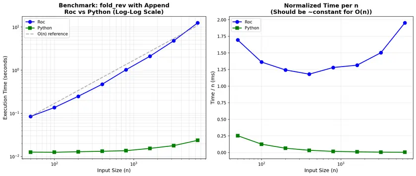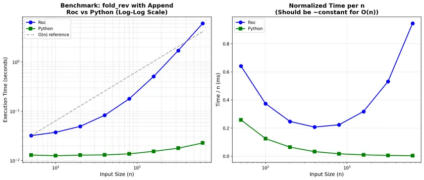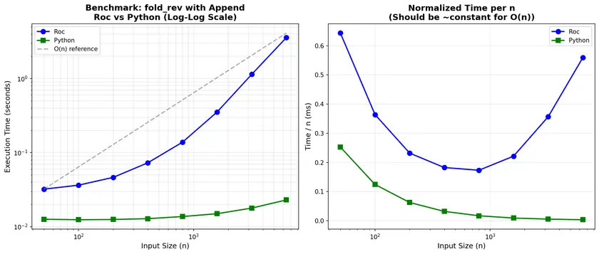 I always made the assumptions when writing the roc code that some of the things Richard presented are present. But if things some things like in-place replacement of lists when RC is 1 are not in the interpreter, it could be a high cost for the way I wrote that. Considering the program took 8GB of ram, there is also most likely an issue with not deallocating intermediate values, there might be degradations of the stack or other parts of the interpreter that keep references to things.